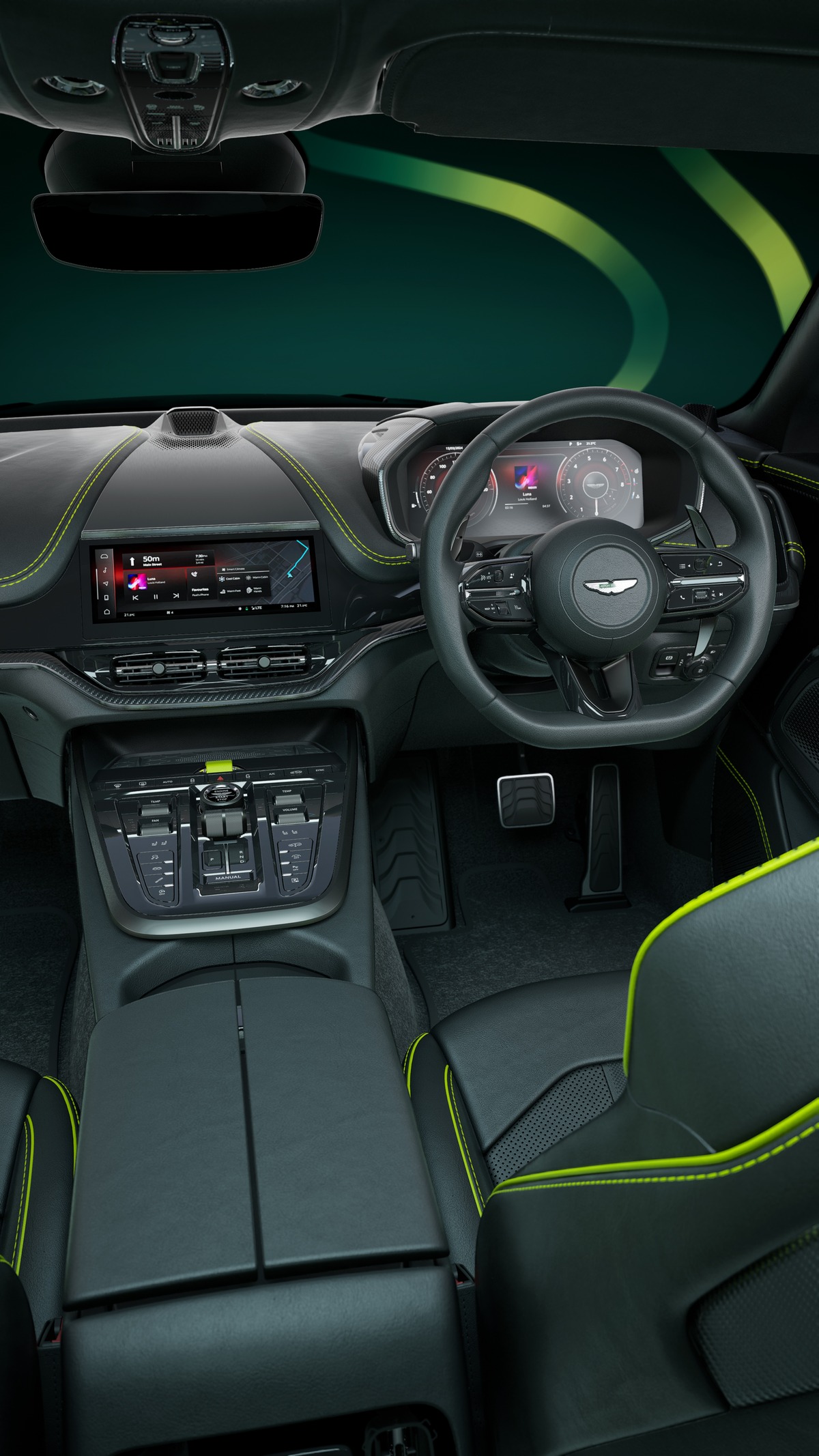 The DBX707 AMR24 Edition has been given the same deliciously vivid racing identity as the brand’s F1 team and the Official Medical Car of Formula One. Pictured here in the rich and vibrant Podium Green, with AMR Lime brake calipers behind 23” Fortis wheels, it also comes in Onyx Black and Neutron White. The Lime Green continues along the lower trim, bringing the world of its Formula One team onto public roads with a striking presence none can ignore. Inside, two new colorways bring the team’s racing heritage into the cockpit with Lime Green contrast stitch and piping. And you can lace the cabin with carbon fiber, dark chrome jewelry and titanium mesh if you so want. You’ll find AMR24 etched door sills and the Aston Martin logo pressed in foil onto the dash, with a hand-stitched lime saddle strap on the wireless charging station, too. It is thoroughly Aston Martin, and thoroughly F1.