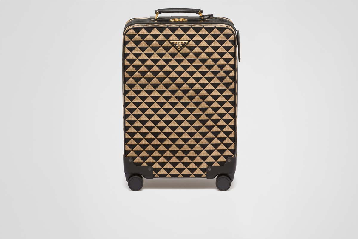 The Prada triangle was first introduced on trunks designed by the fashion house’s founder Mario Prada, and now the company reinvents this iconic symbol in a different way each season. For this sleek trolley, the triangle is embroidered in contrasting colors of black and beige to create a sophisticated and modern geometric pattern. The brand also uses its trademark Saffiano leather to embellish the design. An enameled metal Prada logo is displayed on the front.