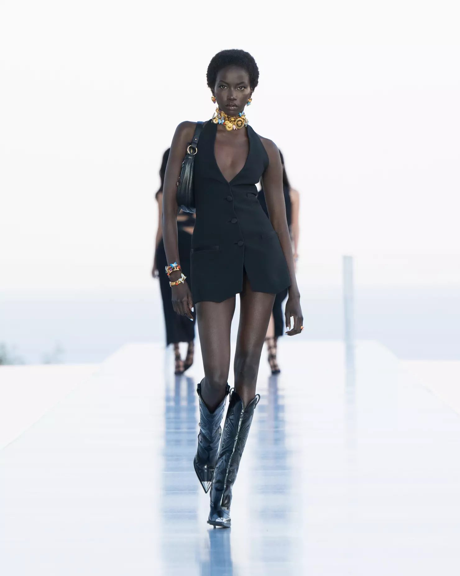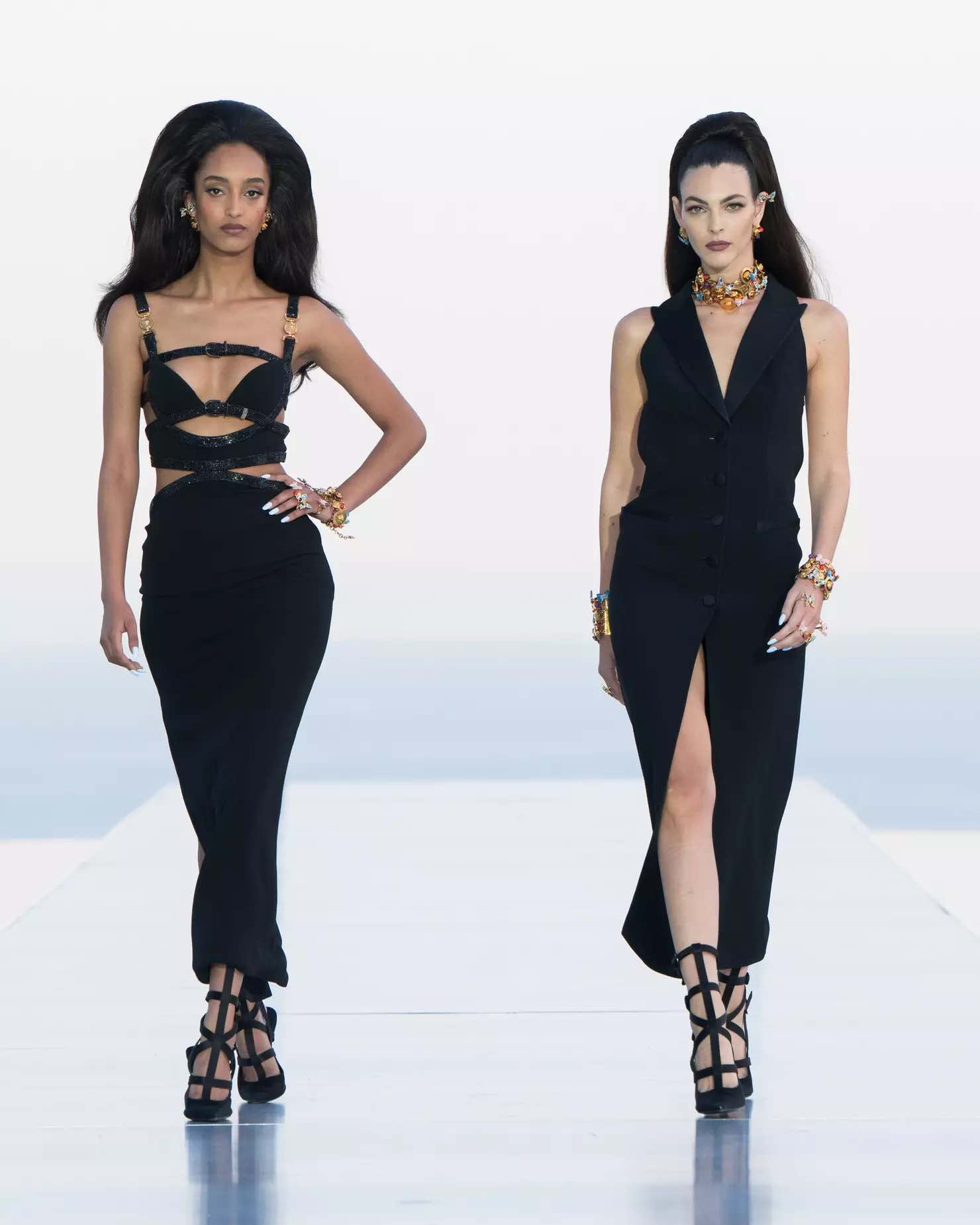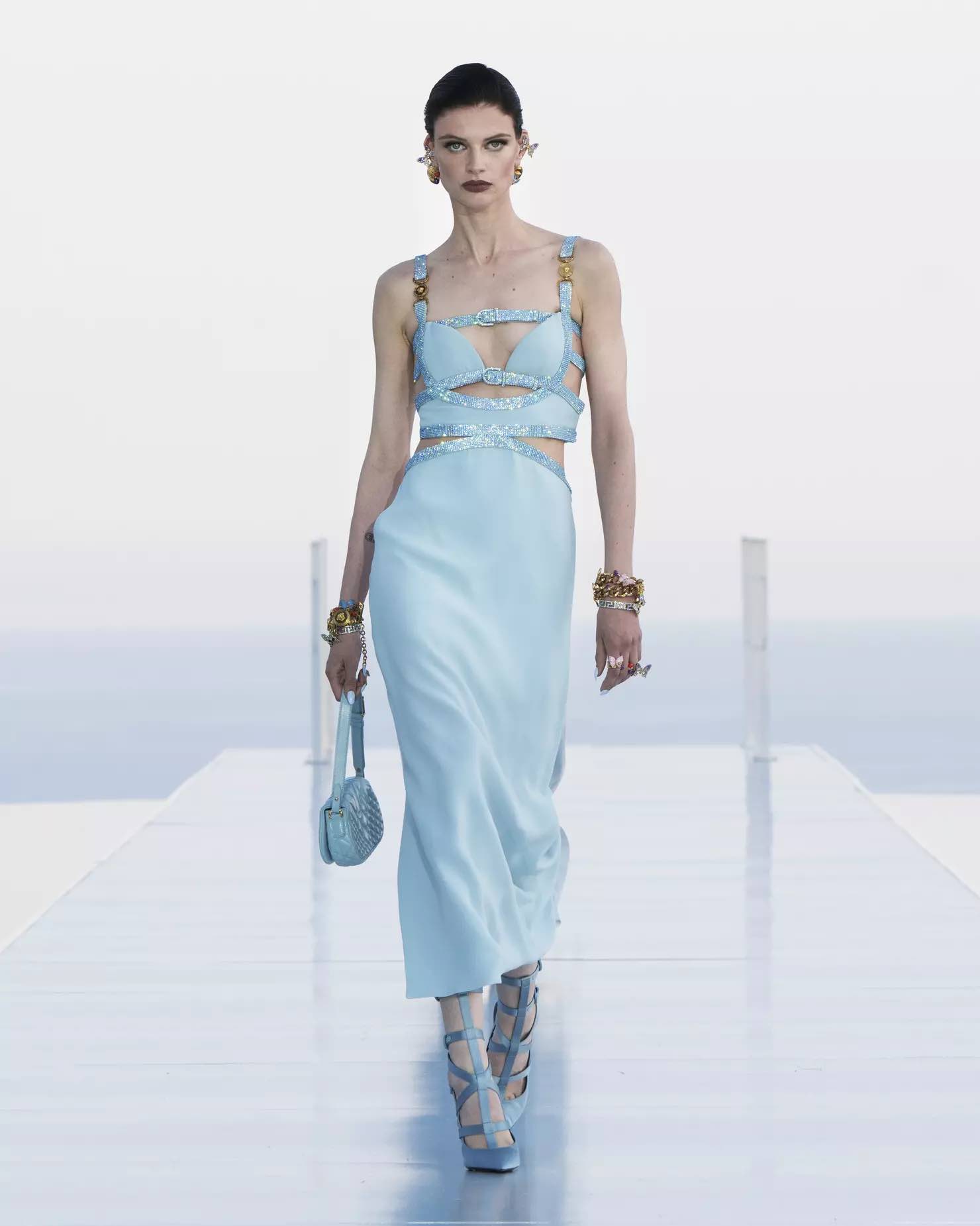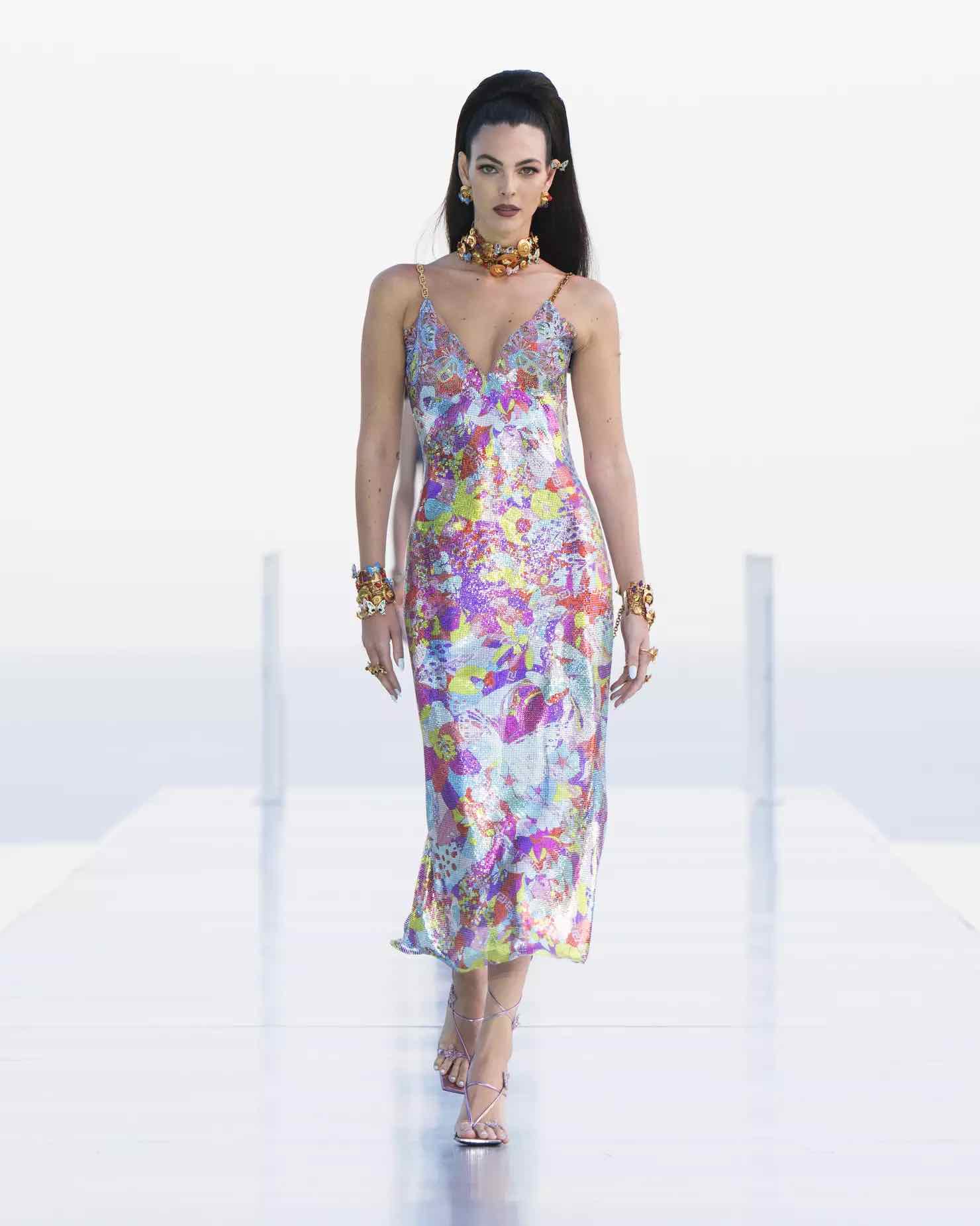 Donatella Versace revealed that the collection drew inspiration from her love for summer and her deep admiration for Dua Lipa. In her statement, she expressed, “Gorgeous colors, fun prints, and light silhouettes. This is the perfect summer collection.” The spirit of vacation and sunshine radiated from the clothes, embodying the joyful essence of the season. It is a collection that seamlessly transitions from lounging by the pool in a playful printed bikini to dressing up for sultry summer evenings in the perfect evening gown.
