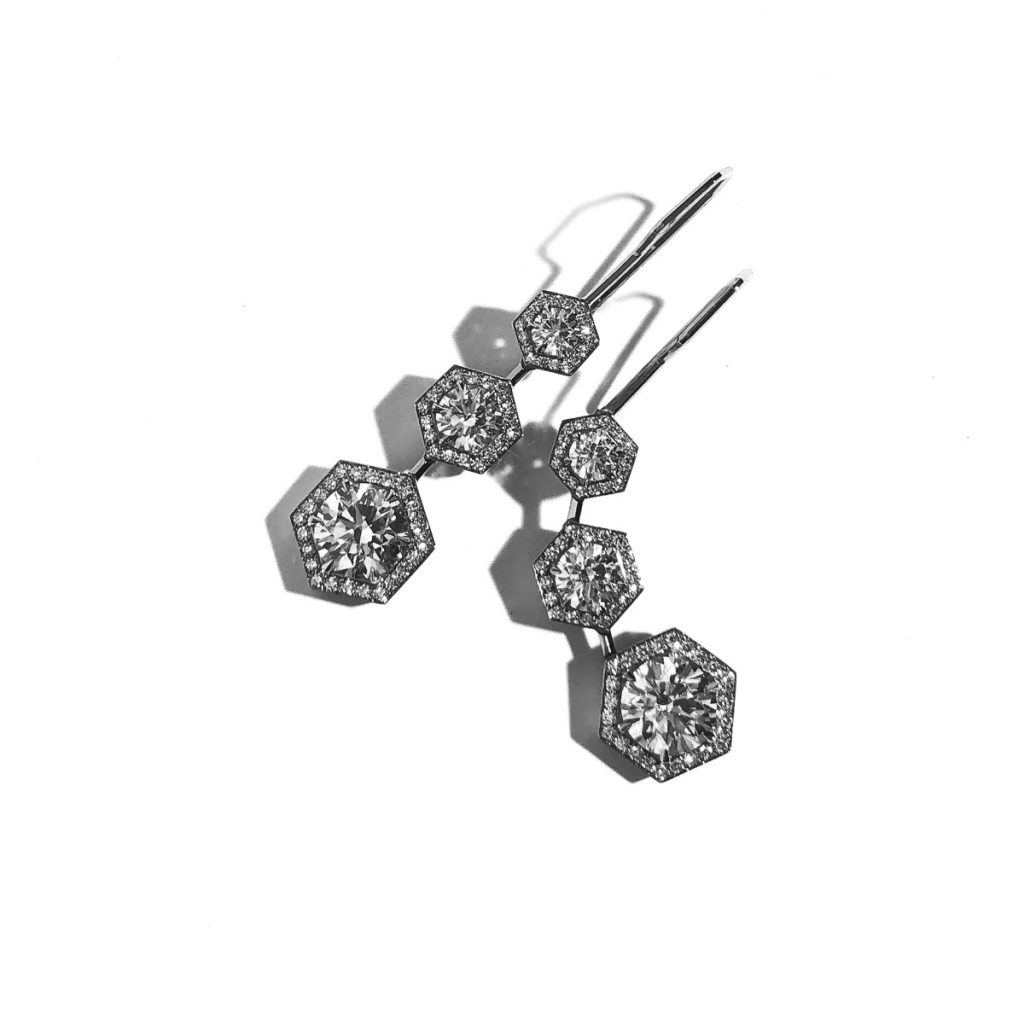 Hex Diamond Pendant Earrings by Geoffrey Good – 18K white gold with diamond pave surrounding. The six center stones are 6+ tcw.