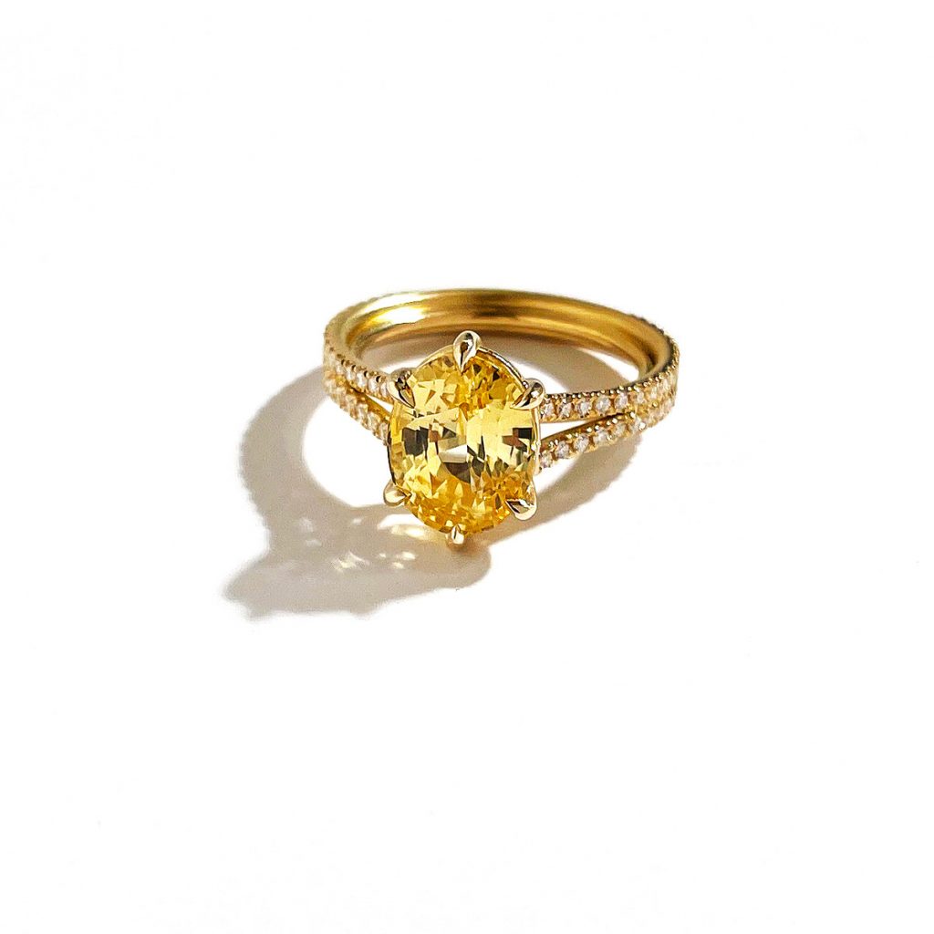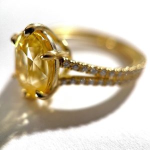Yellow Sapphire Ring by Geoffrey Good 5 ct. certified unheated Sri Lankan sapphire with diamond melee in a split shank 18K yellow gold ring