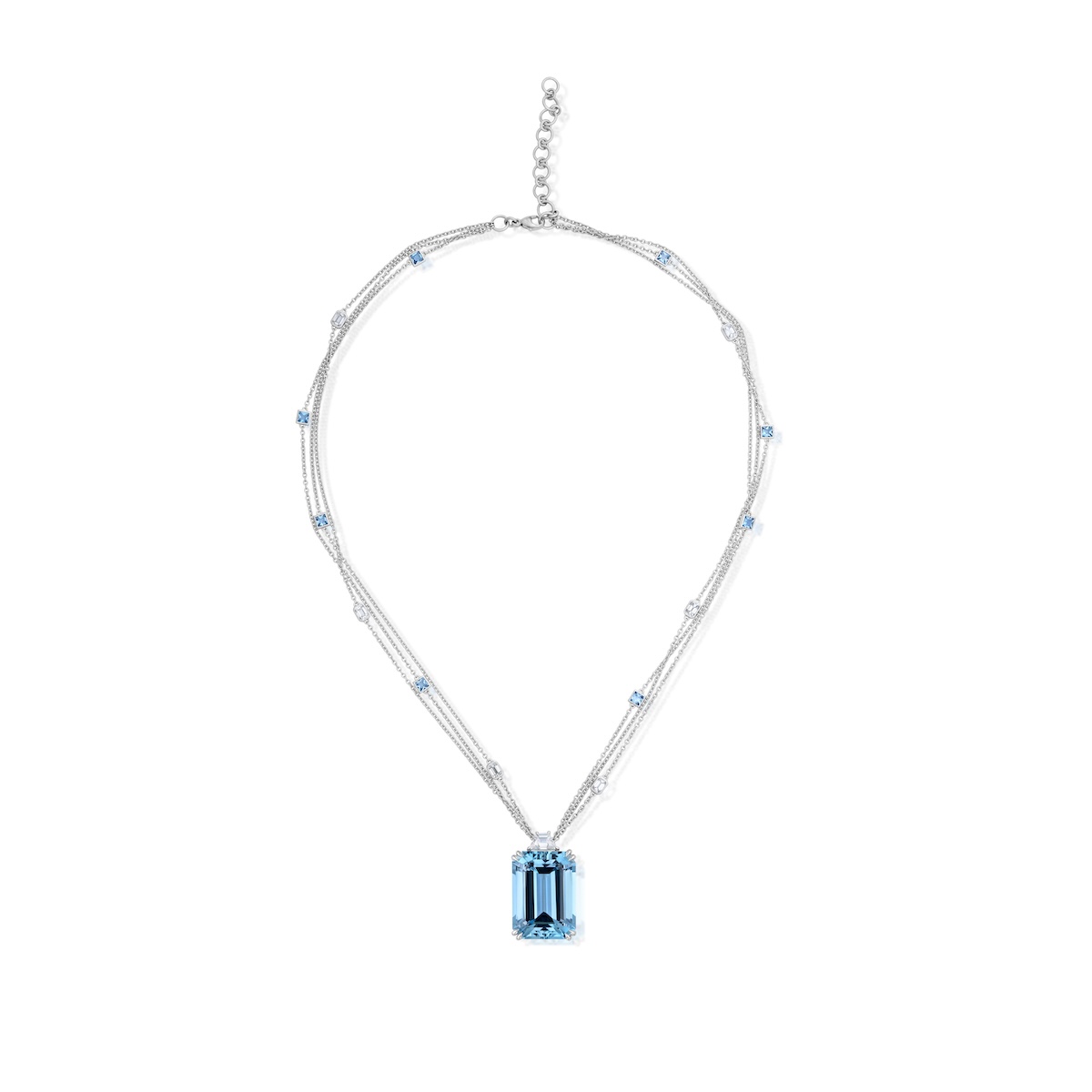 Centered around a stunning 33.33 Carat aquamarine, this necklace is an epitome of sophistication. The stone’s intense blue is complemented by diamonds and additional aquamarines set on a luxurious platinum chain.