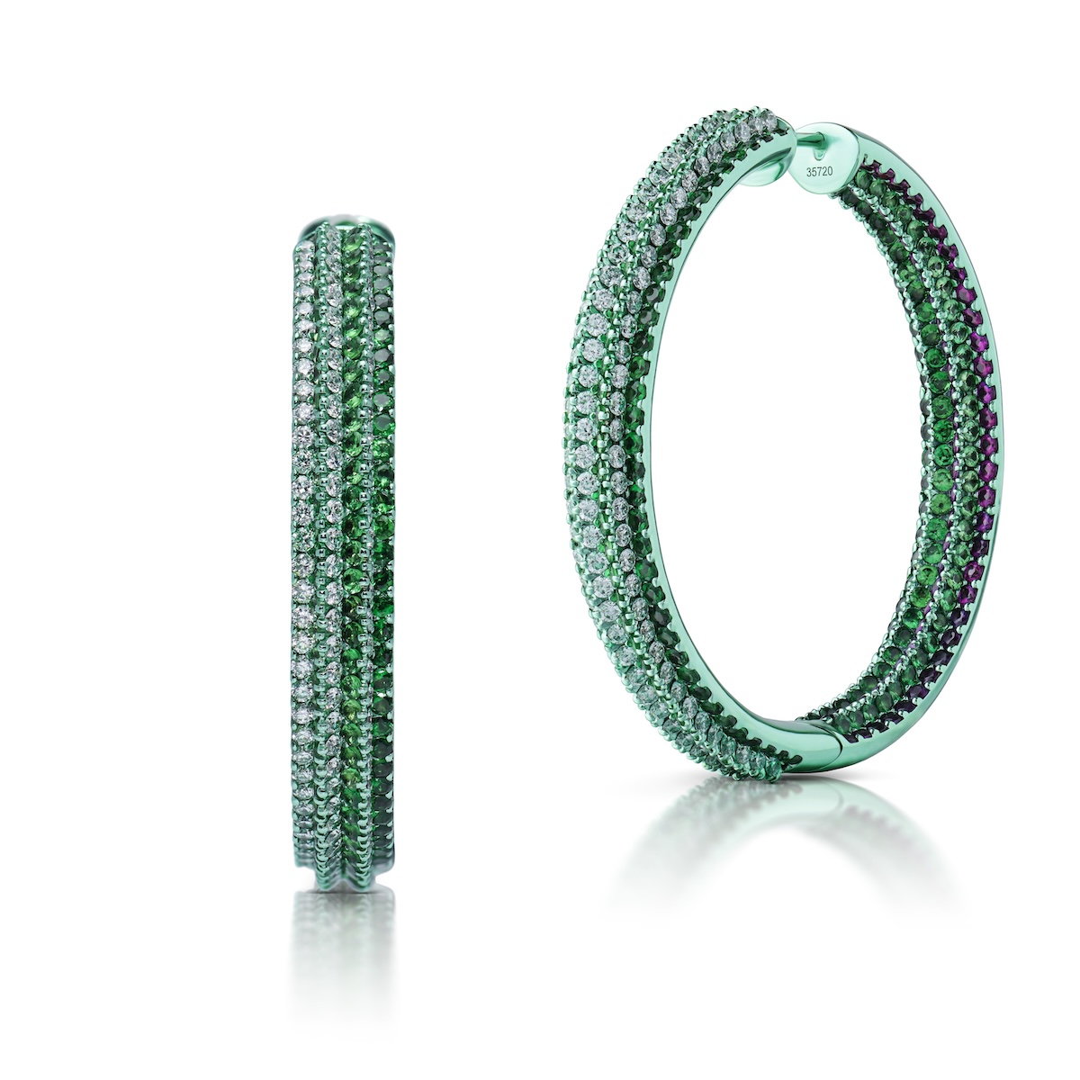 These 6.72 Carat Tsavorite Garnet Inside Out Hoop Earrings are a testament to nature’s beauty and the meticulous craftsmanship of Stephen Silver. The earrings feature vivid green tsavorite set in 18 karat white gold hoops, uniquely coated in green titanium and accented with rubies, pink sapphires, and diamonds.