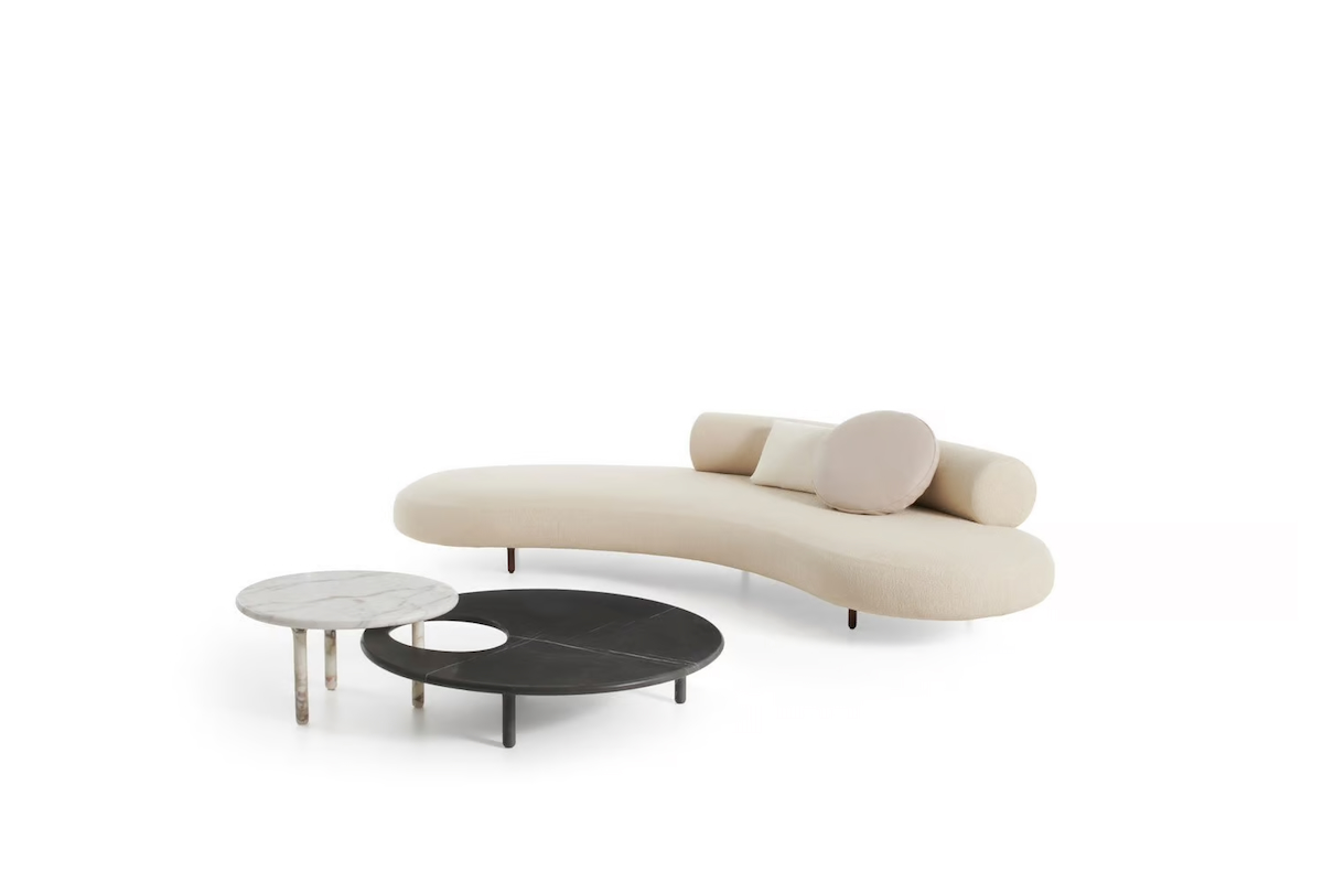 The Honoré sofa is a masterpiece of organic shapes and Pop art influence. Designed by Elisa Ossino for De Padova, this piece is a blend of comfort and aesthetic appeal. It stands out with its curved seat, circular backrest, and turned wooden feet, emphasizing the art of craftsmanship. Available in two sizes, Honoré is accompanied by complementary coffee tables, marrying marble and lacquered finishes to create a sculptural effect.