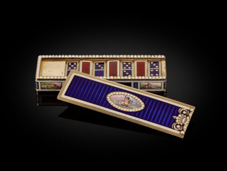The pearl-set box that houses 28 pieces or domino ‘counters’ features ornate craftsmanship of gold and enamel. Fashioned in Switzerland by renowned watchmakers Bautte & Moynier, Geneva, 1804-1808, the set’s pieces are contained in a gem coated box that features “an oval vignette” of “Cupid sailing on his quiver before a mountainscape,” notes Sotheby’s.