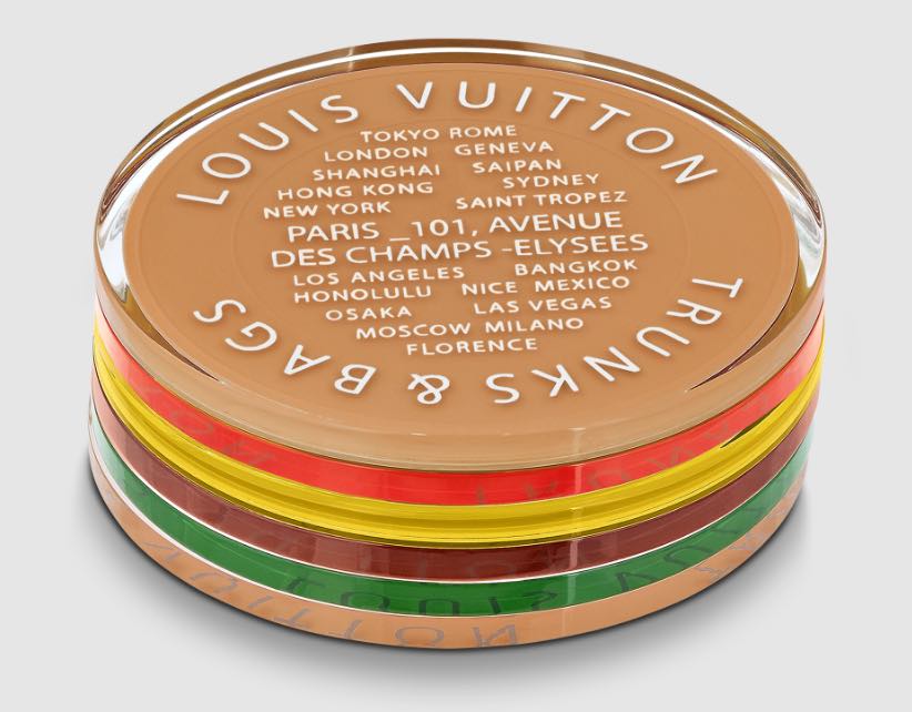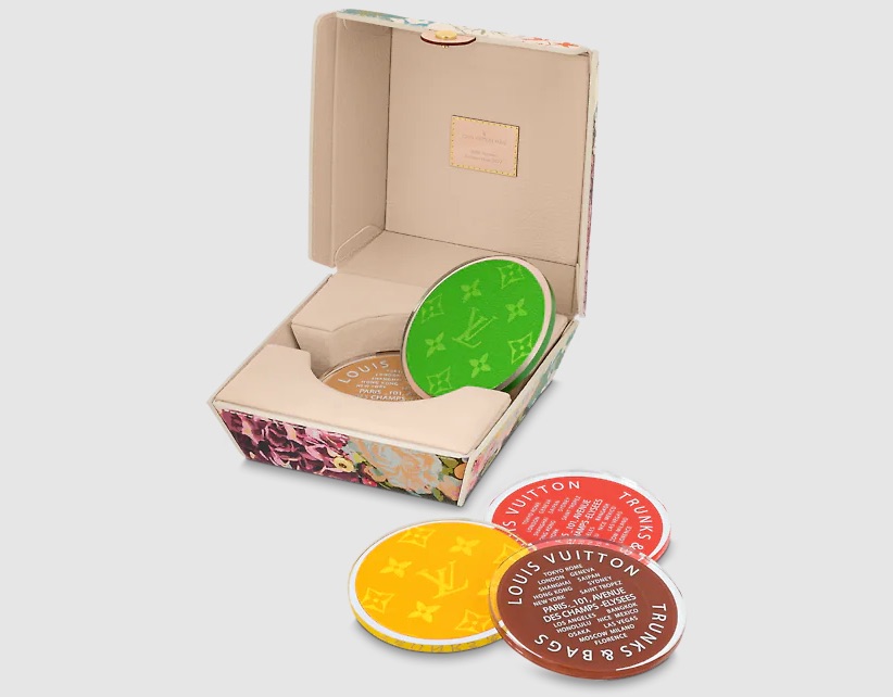 Display the food-centered favorite on your leather ottoman or game table, and it will soon become one of your most-loved conversation pieces. Guests will discover the world’s most prestigious LV brick-and-mortar destinations etched across the center of each coaster in the set.