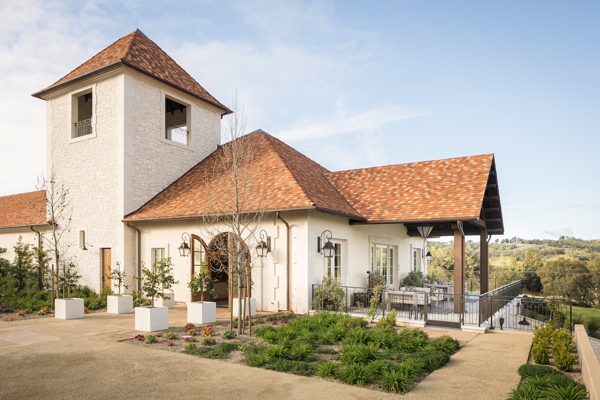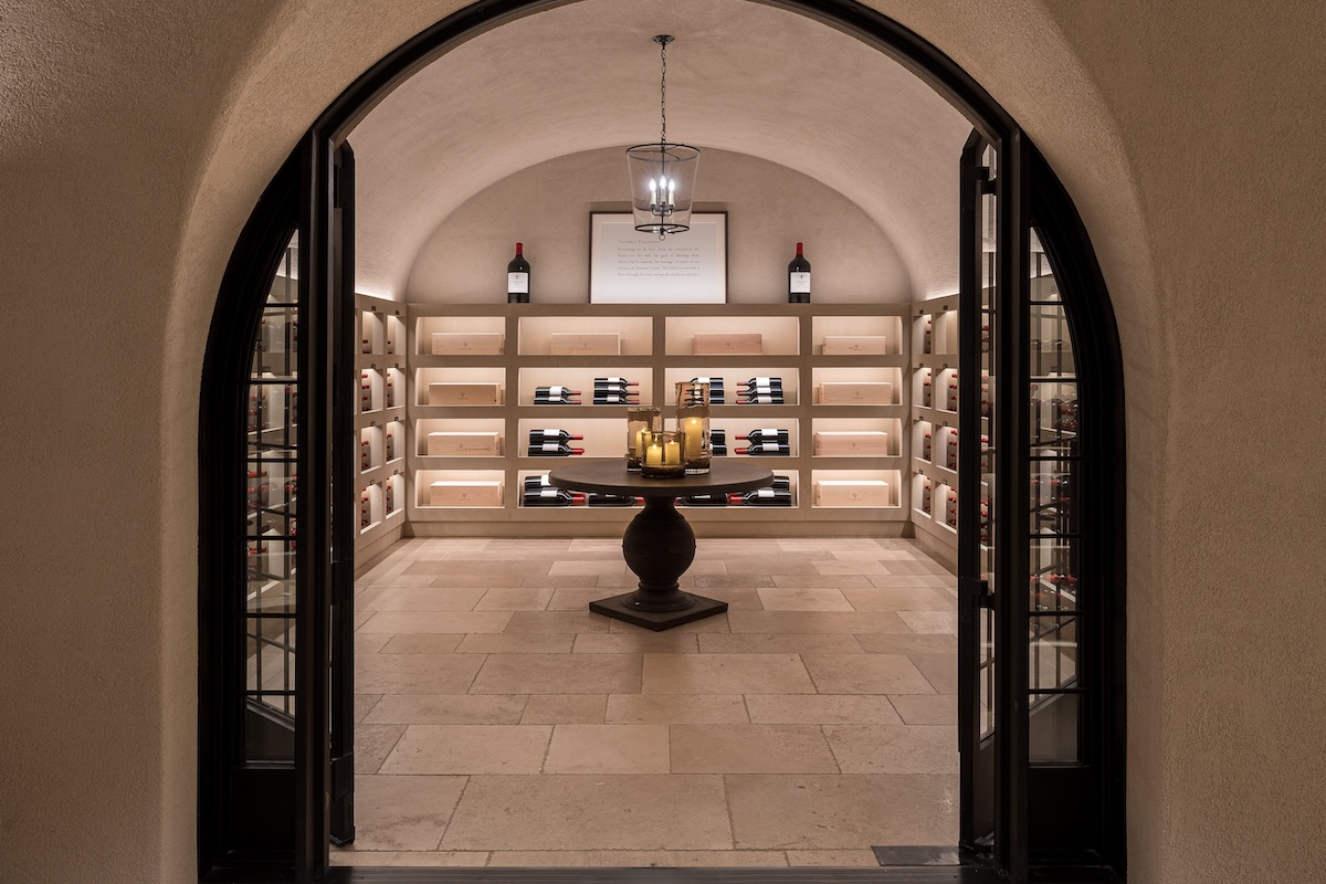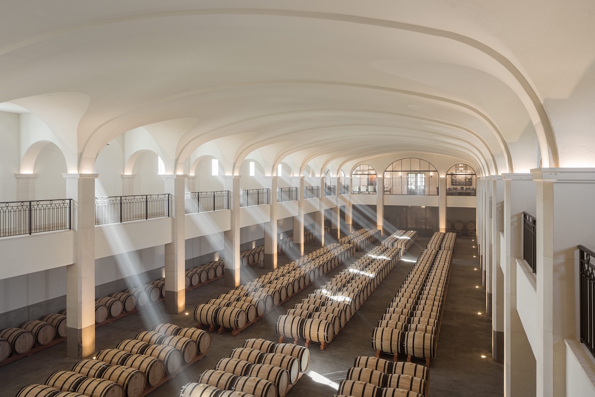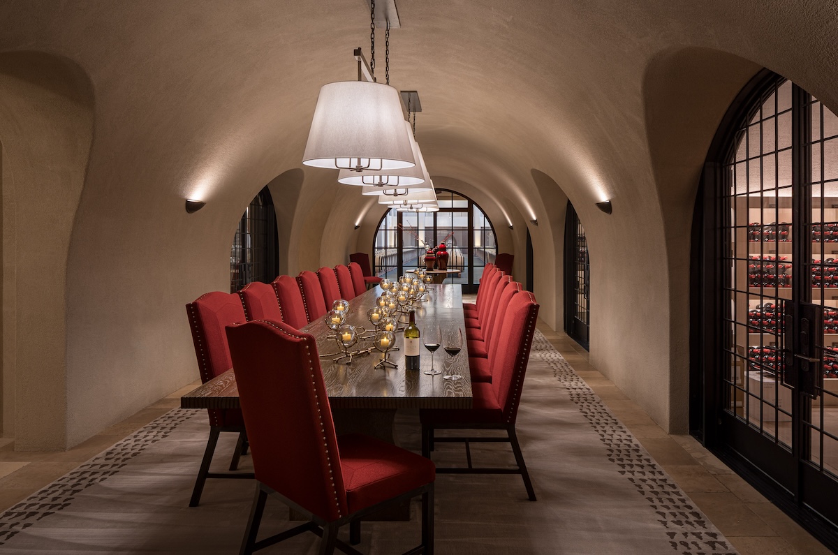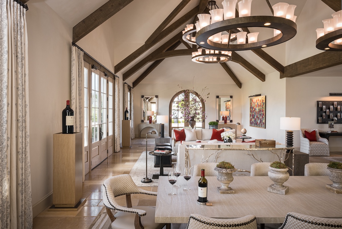 “During harvest, my mom would take me on weekends to the different wineries. It was before cell phones, so that was the only way I could still know that I had a dad for three months out of the year,” Hélène laughs, fingertips playing along the stem of a wineglass in a narrow, lushly appointed dining room. This is just one of several hospitality spaces in Vérité’s new chateau, a grand, French-style stone building with interiors decorated in a fusion of classic European grandeur and California easiness. Its centerpiece is the barrel chai, where the wines are funneled from the neighboring production facility via an underground transfer system to rows of wooden casks beneath a dramatic vaulted ceiling.