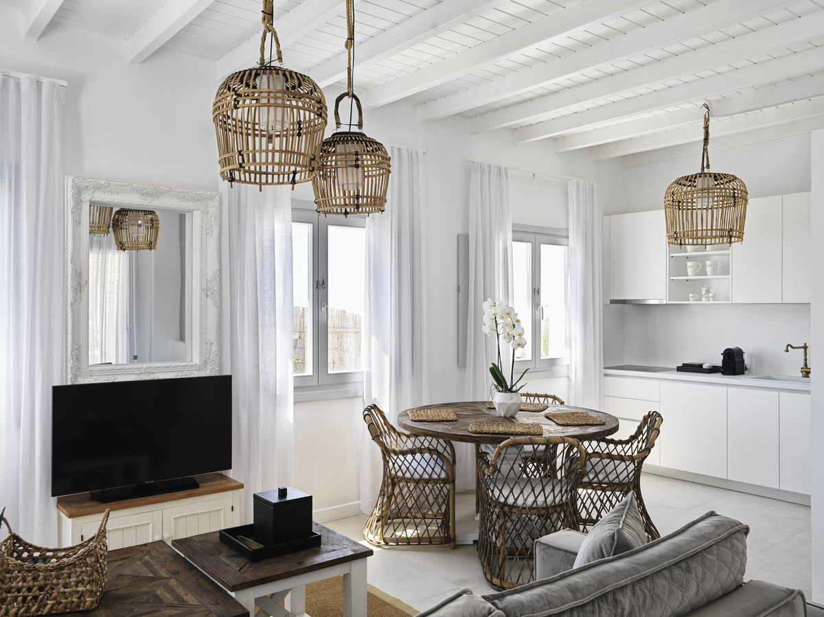 On Mykonos, Katikies features three categories of luxury villas that are the epitome of luxury. Their white-washed facades are in the island’s quintessential style, cascading over multiple levels down the arid hillside. They range from one- to three-bedroom villas that sprawl over multiple levels with spacious living rooms and private outdoor terraces outfitted with infinity pools and dark wooden furnishings and lightened by gauzy curtains and exposed white beams.