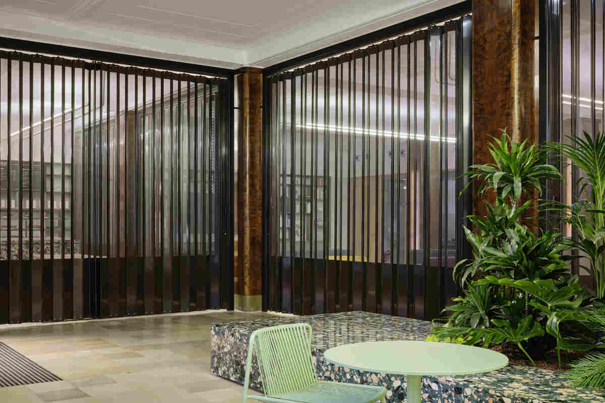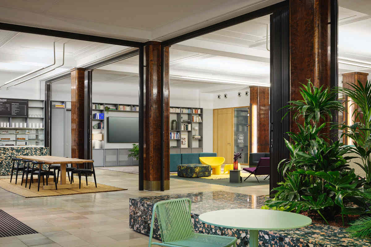 PSD Bank’s intimate community space cleverly blends shiny metals, pickled woods, and terrazzo with recycled materials. The historical colors meticulously preserved over a century of paint layers, add a touch of authenticity. The bank seamlessly blends contemporary and traditional design principals, resulting in a harmonious style.