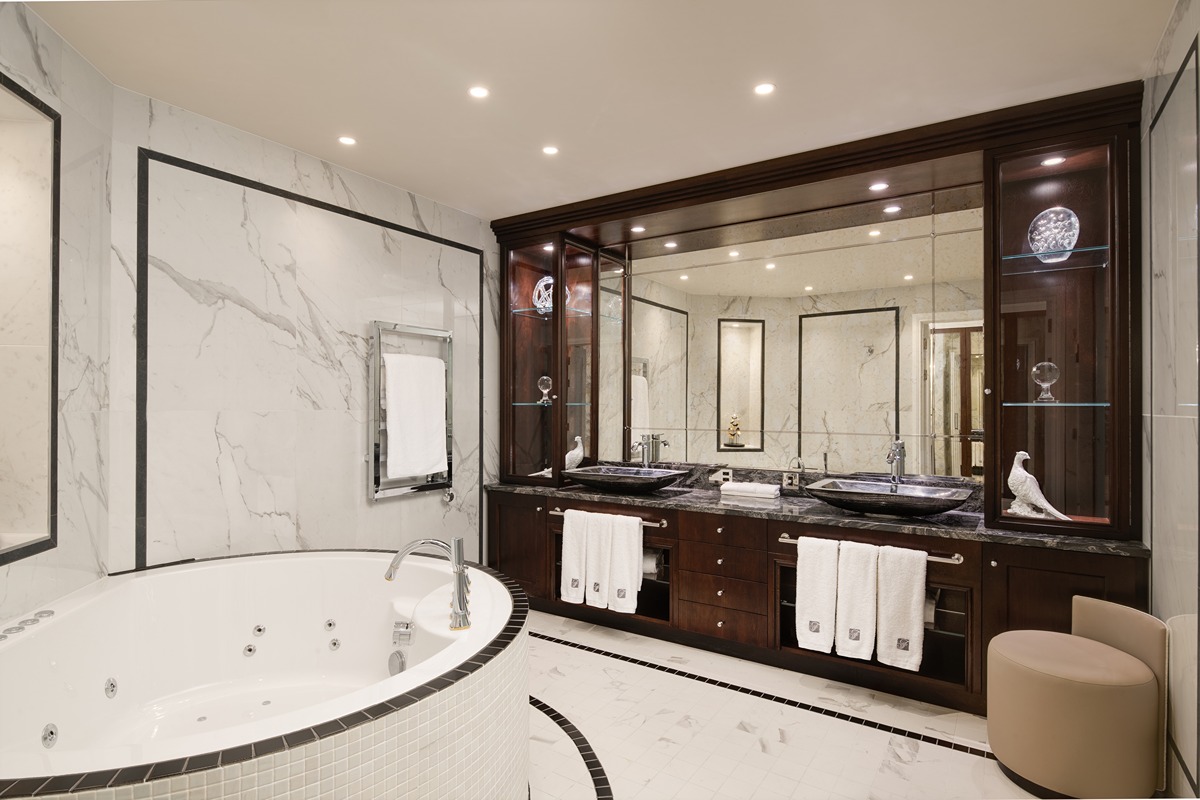 Of course, no royal suite is complete without its own elevator down to the private spa suite, right? It’s yours to use and yours alone. Everything in the Signature Royal Suite feels exquisite, right down to the throne in the bathroom—a warmed, automatic, Japanese smart toilet with more settings than you could dream of. With the large, round jacuzzi bathtub, the enormous bedroom flatscreen TV, the four-poster beds and the regal balcony overlooking soothing park views, this seems an experience made with Royals in mind (and though the hotel is sworn to secrecy, we suspect it’s likely been put to the test).