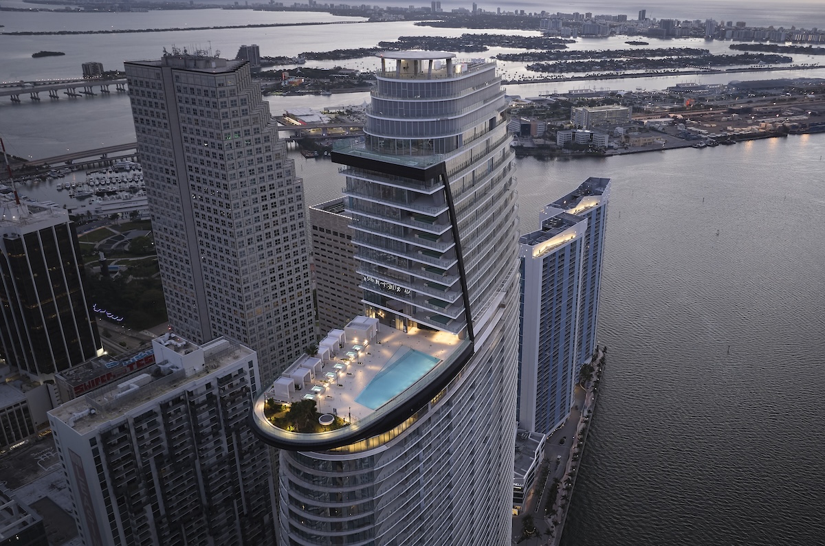 Strategically positioned where the Miami River meets Biscayne Bay, Aston Martin Residences Miami stands as a beacon of luxury. The choice of location is as deliberate as it is symbolic, capturing the essence of Miami’s dynamic and picturesque environment. The building’s design utilizes curvilinear forms that echo the sleek lines of Aston Martin’s sports cars, integrating the brand’s ethos of beauty, luxury, and engineering into every aspect of its architecture and interior spaces.