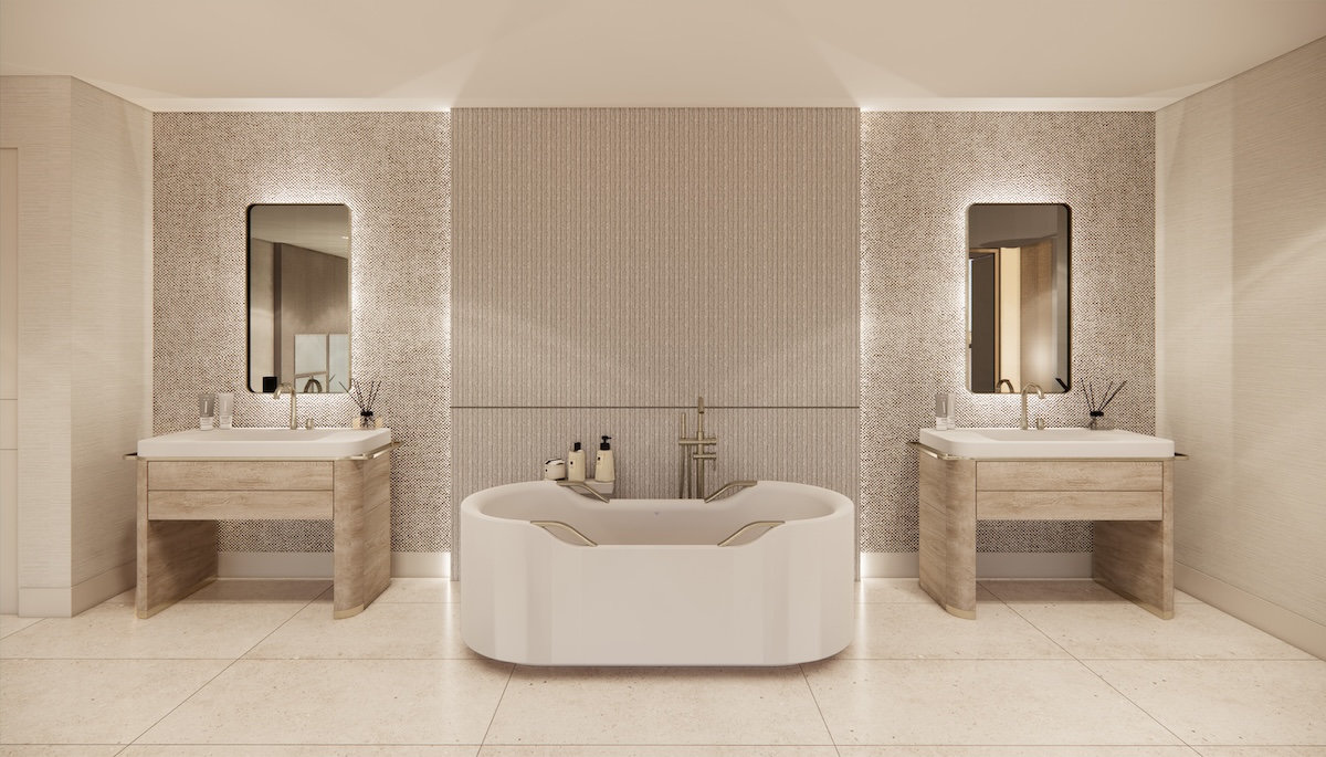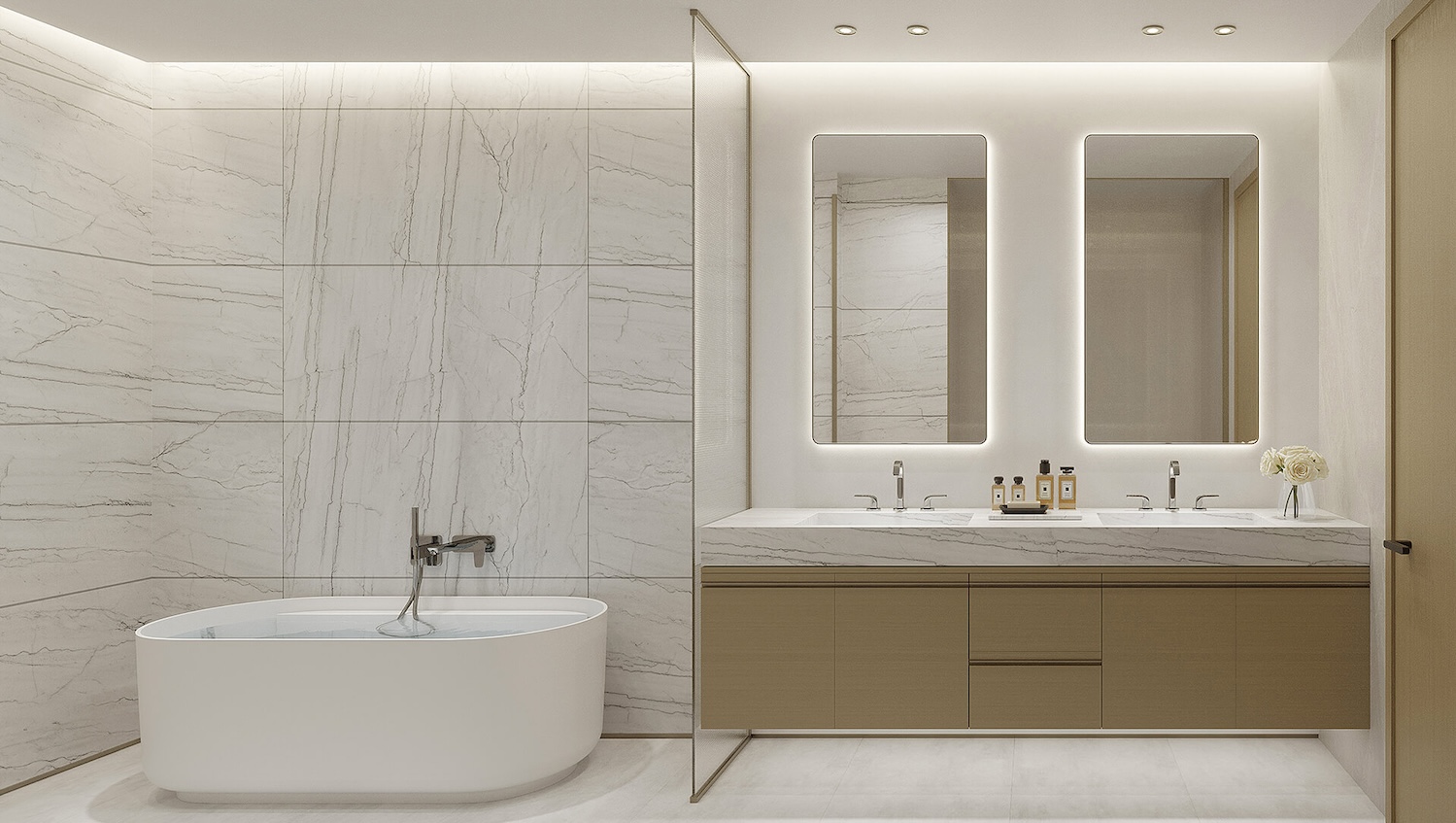 The living spaces at Shoma Bay are meticulously designed to maximize area and provide ample space for living, entertaining, and relaxing. Residences feature floor-to-ceiling sliding glass doors leading onto spacious balconies, modern porcelain flooring, energy-efficient windows, and smart home technology. Kitchens are equipped with modern Italian cabinetry, Dekton countertops, a premium Miele appliance package, and for penthouses, an exclusive Gaggenau appliance package. Bathrooms offer spa-inspired finishes, modern cabinetry, designer vanities, and for penthouses, an exclusive Armani bathroom collection.