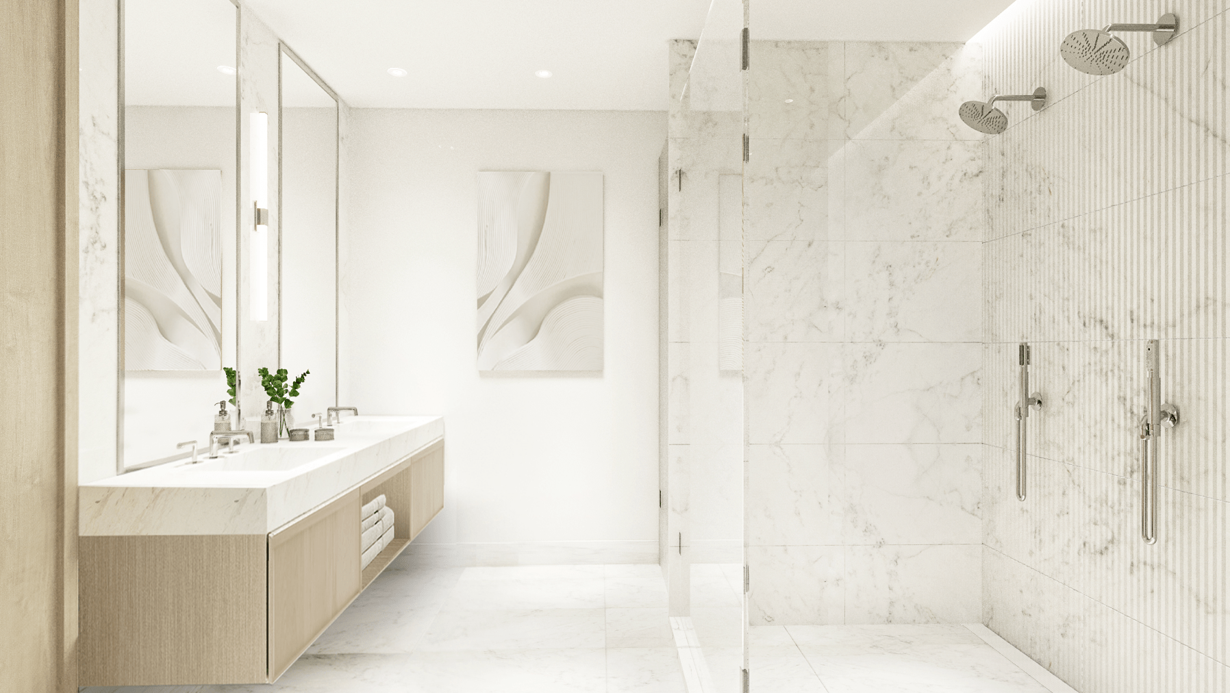 Kitchens in each residence are outfitted with state-of-the-art Sub-Zero/Wolf integrated appliances, custom European cabinetry, and quartz countertops, offering a blend of functionality and elegance. The primary baths are a haven of luxury, featuring marble-clad finishes, custom double-sink vanities, and glass-enclosed wet rooms with dual rainfall shower heads for select residences.