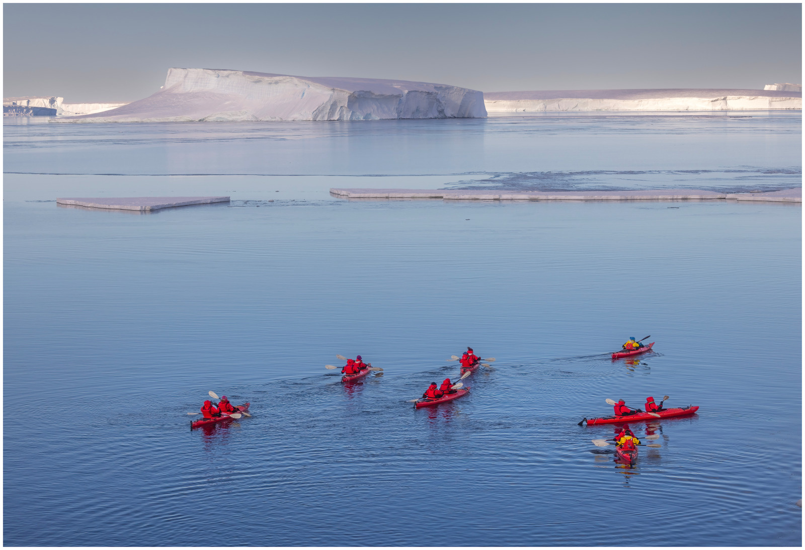 Kayaking. Dip your oar into the sea, propelling yourself at a rhythmic pace. Water sloshes and swirls with each stroke and it feels invigorating to interact with the Antarctic so intimately. You navigate toward the coast, absorbing all the nooks and crannies of the Great White Continent. Pausing a few minutes from paddling, you cannot remember experiencing such stillness, silence, and awe. You listen: to your breathing, to the lilting water, to the peace and tranquility of Antarctica.